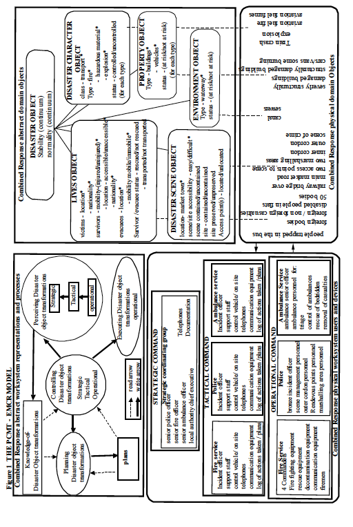 In the framework, a domain of application (or work domain e.g. the disaster) is described in terms of objects, which may be abstract or physical. Objects are defined by their attributes, which have values. The attribute values of an object may be related to the attribute values of one or more other objects. An object at any time is determined by the values of its attributes. The worksystem performs work by changing the value of domain objects (i.e. by transforming their attribute values) to their desired values, as specified by the work goal.