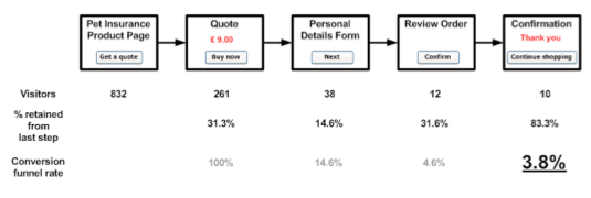 If we take an example, Figure 1 shows illustrative conversion funnel data for a ‘quote and buy’ service, offered by a business in the digital channel. A five page journey is of interest, and while all pages are tagged, a conversion funnel has been set‐up for a user journey from offering a quotation, to purchase confirmation – the last four pages of the journey.