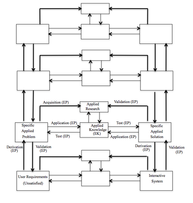 The framework has a general problem (as applied design) with a particular scope (as human computer interactions to do something as desired). Research ( as acquisition and validation) acquires (as study and practice) and validates (as confirms) knowledge (as guidelines; heuristics/methods/expert advice/successful designs/case-studies). This knowledge supports (facilitates) practices (as trial-and-error and implement and test), which solve (as resolve) the general design problem of applied design.
