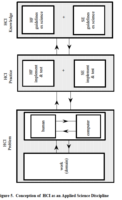 An applied science discipline is one which recruits scientific knowledge to the practice of solving its general problem – a design problem. HCI as an applied science discipline uses scientific knowledge as an aid to addressing the general problem of designing humans and computers interacting to perform work effectively. HCI as an applied science is represented schematically in Figure 5.
