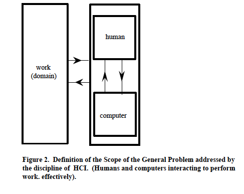 Taken together, these implications suggest a definition of the scope of the general (discipline) problem of HCI. It is expressed, in summary, as ‘humans and computers interacting to perform work effectively’; it is represented schematically in Figure 2. This definition, in conjunction with the general definition of disciplines, will now enable expression of a framework for conceptions of the HCI discipline.