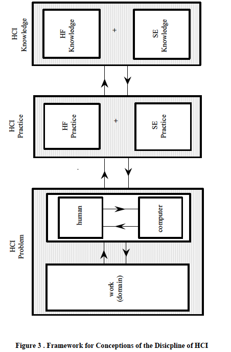 ‘the use of HCI knowledge to support practices seeking solutions to the general problem of HCI of designing humans and computers interacting to perform work effectively. HCI knowledge is constituted of HF knowledge and SE knowledge, respectively supporting HF practices and SE practices. Those practices respectively address the HF general problem of the design of humans interacting with computers, and the SE general problem of the design of computers interacting with humans’. The framework is represented schematically in Figure 3.