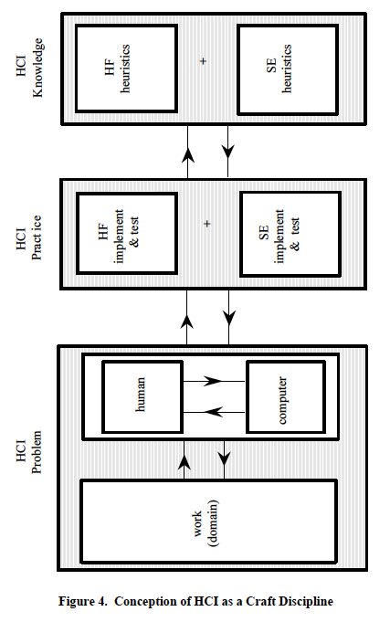 Craft disciplines solve the general problems they address by practices of implementation and evaluation. Their practices are supported by knowledge typically in the form of heuristics; heuristics are implicit (as in the procedures of good practice) and informal (as in the advice provided by one craftsperson to another). Craft knowledge is acquired by practice and example, and so is experiential; it is neither explicit nor formal. Conception of HCI as a craft discipline is represented schematically in Figure 4.