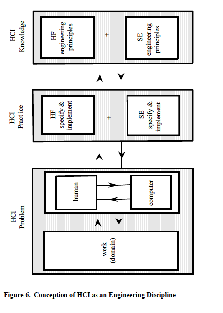 A further issue which can be explained concerns the relationship between HF and SE during system development. In particular, there is a complaint by SE that the contributions of HF to system development are ‘too little’, too late’ and unemployable (Walsh, Lim, Long, & Carver [1988]). Assuming HCI to be an applied science discipline, HF contributions are too little because psychology does not address the general problem of design and so fails to provide a set of principles for the solution of that problem. HF contributions are too late, because they consist largely of evaluations of designs already implemented, but without the benefit of HF. They are unemployable, because they were never specified, and because implemented designs can be difficult, if not impossible, and costly to modify. Within an HCI engineering discipline, HF contributions would be adequate (because within the scope of the discipline’s problem); on time (because specifiable); and implementable (because specified). Landauer’s plea (Landauer [1987b]) that HF should extend its practice from implementation evaluation to user requirements identification and the creation of designs to satisfy those requirements can be similarly explicated.