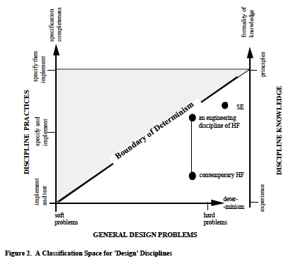 It should be clear from Figure 2 that there exists no pre-ordained relationship between the formality of a discipline’s knowledge and the hardness of its general design problem. In particular, the practices of a (craft) discipline supported by experience – that is, by informal knowledge – may address a hard problem. But also, within the boundary of determinism, that discipline could acquire formal knowledge to support specification as a design practice.