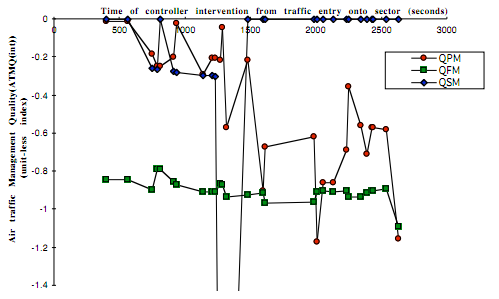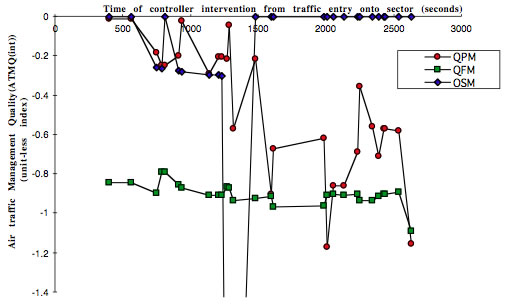 Figure 4 illustrates this second principal form of ATMQ – the assessment of ATMQ(int) for all aircraft with each intervention of an individual controller. For the sake of clarity, only the qualities of safety (QSM), fuel use (QFM) and progress (QPM) are shown. For each management intervention made by the controller during the period of the task, these three management qualities are described, each triad of data points relating to an instruction issued by the controller to one of the six aircraft.