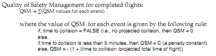 This rule means that if at a given airtraffic event, two aircraft are on a collision course and are less than a safe separation apart (300 seconds), then a penalty is immediately given, commensurate with a ‘near miss’ condition. When aircraft are on a collision course but a long way apart, safety is assessed as a function of closing time and projected time of complete flight. The form of function which this rule supplies is such that QSM is optimal when a value of zero is returned, meaning that at no time was the aircraft in separation conflict or on a course leading to a conflict no matter how far apart. The value increases negatively when conflict courses are instructed, and sharply so (as given by constant C) when those courses occur with less than a specified track and vertical separation.