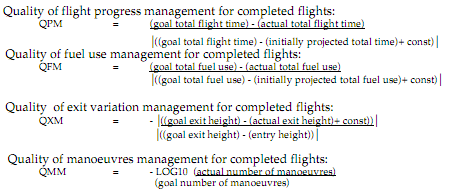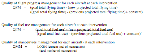 The forms of function of the unit-less indices provided by these ratios are such that in each case, quality of management is optimal when a zero value is returned, that it to say, when actual state and goal state are coincident. QPM and QFM are greater than zero when respective actual states are better than goal states, and less than zero when they are worse (it is possible for actual values of fuel consumed or flight time to be less than their goal values). The difference is given by proportion with the difference that would have been the case if there had been no interventions by the ATM worksystem over the scenario. In this way, the added value of the worksystem’s interventions is indicated.
