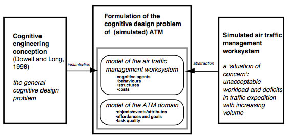 Figure 1. Formulation of a cognitive design problem. The problem is abstracted over a simulated ATM system which presents a situation of concern. The problem formulation instantiates a conception for cognitive engineering .