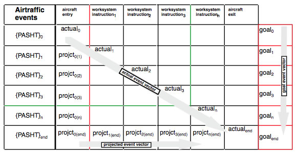 Three different sorts of airtraffic event vector can be defined: actual; projected and goal. Each vector posseses the same classes of task attribute, but each arises from different air traffic events. Figure 2 schematises the three event vectors within an event vector matrix.