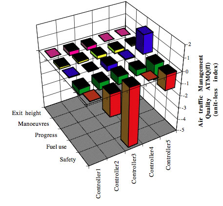 Figure 3 illustrates the assessment of ATMQ(fl) – in other words the assessment of management qualities over completed flights for the controllers separately managing the same traffic scenario. The scenario consisted of six aircraft entering the sector over a period of 45 minutes. ATMQ(fl) was first computed for each form of management quality, for each aircraft under the control of each controller. Figure 3 presents a summation of this assessment for each of the controllers for each of the five management qualities but for all six individual flights. For example, we are able to see the quality with which Controller 1 managed the safety (i.e., QSM) and fuel use (i.e., QFM) of all six aircraft under her control over the entire period of the task.
