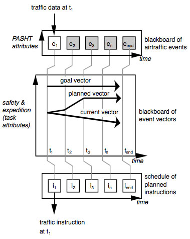The blackboard of event vectors has two dimensions, a real time dimension and a dimension of hypotheses about the task attributes of event vectors. The hypotheses then concern the attributes of safety and expedition of each vector, where the attribute of expedition subsumes the individual attributes of progress, fuel use, number of manoeuvres and exit height variation. Knowledge sources separately associated with this blackboard support the construction of hypotheses about the attributes of event vectors. For example, knowledge sources about the minimum legal separations of traffic, and about aircraft fuel consumption characteristics, support the construction of hypotheses about safety and fuel use, respectively. Other knowledge sources support the ATM worksystem in reasoning about differences between the current vector and goal vector, and in constructing the planned vector.