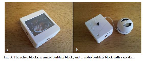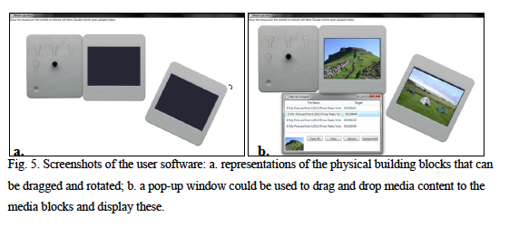 with the physical components by using tangible building blocks that can display digital images or play audio files.