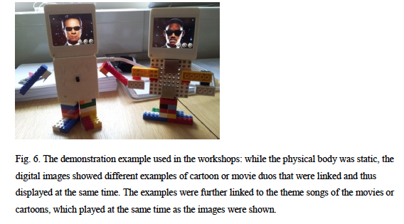 Looking at the characteristics of hybrid crafting, as we found them in our workshops, and how we envision them to be ideally, we can conclude that most evolve around a thorough integration of physical digital in both crafting process and crafting result. First, exploration, experimentation, and iteration should be encouraged both with physical and digital materials – it should be easy to switch between building with physical and digital materials, and ideally the ways of working with physical and digital materials should be similar. We saw that while the physical triggered plenty of exploration when participants were left without instruction, they seemed to think more before building ‘final creations’. We envision physical making iterations alongside digital iterations can trigger new ideas, and new creative connections can be found when making practices become more integrated. Similarly, we saw that participants tended to start from the digital media and create their physical representations around these. This, as mentioned, was influenced in part by the set-up of the workshops, but it may reflect an important difference in crafting with physical and digital materials. For digital crafting the starting point, or base material, will in our definition of hybrid crafting most often be digital media files, such as images or audio, rather than bits and bytes, while for physical crafting a starting point can be any base material, such as wood, paper or clay. Even looking at the Materialise set, physical building blocks could be used to many ends, despite having predetermined sizes and shapes, as was illustrated by our participants experimenting, while digital media files often contain concrete representations, which makes it seemingly difficult to use them to novel ends. So, apart from providing a more concrete material – giving more concrete handles to start from – digital media are also less flexible to start from than physical materials, and less open for different interpretations, and thus more difficult to fit into creations later. Although it can be challenging to find creative new angles to the content of digital media, we believe overcoming these challenges may increase the ‘craftiness’ of including digital materials. Both physical and digital materials can thus provide their own interesting starting points and we believe that hybrid crafting thus provides an interesting combination of crafting challenges and possibilities; an integration of concreteness and openness that can lead to new ways of thinking about crafting and novel creative expression.