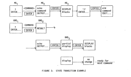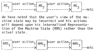 In the course of an interaction with a system a number of changes take place in the state of the machine. At the same time the user’s perception of the machine state is changing. It will happen that the user misjudges the effect of one command and thereafter’ enters others which from an outside point of view seem almost random. Our point is, as before, that the interaction can only be understood from the point of view of the user.