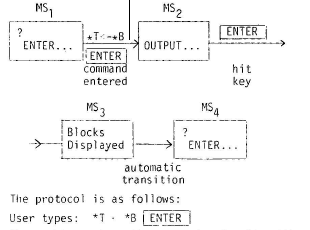The next stage can be achieved by means of a protocol. In it we would wish to separate out those actions which spring from the users concept of the machine and those actions which were a result of him being forced to do something to keep the interaction going. This we call ‘heuristic behaviour’. This can take the form of guessing that the piece of information which is missing will be consistent with some other system or machine. “If in doubt, assume that it is Fortran” would be a good example of this. The user can also attempt to generalise from aspects of the current system he knows about. One example from our study was where the machine apparently failed to provide what the user expected. In fact it had but the information was not what he had expected. The system was ready for another command but the user thought it was in some kind of a pending state, waiting with the information he wanted. In certain other stages – in particular where a command has produced a result which fills up the screen – he had to press the ENTER key – in this case to clear the screen. The user then over-generalised from this to the new situation and pressed the ENTER key again, remarking