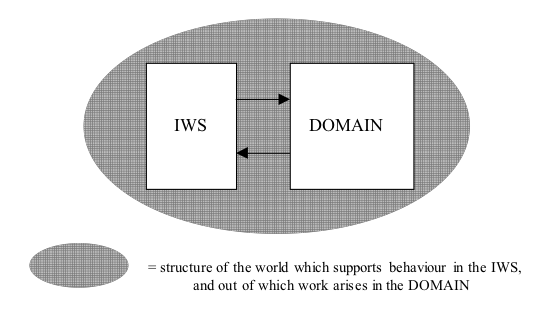 As Dowell & Long (Dowell & Long, [8] & [9] have it, the conception of the design problem involves the fundamental duality of agents’ behaviour and the transformation of the domain contents, its objects and attributes. These are, respectively, the Interactive Work System (IWS) and the Domain of Work (the Domain) (Figure 1).