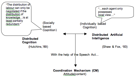 Thus, to bring together the observations of Hutchins and Schmidt: cognition is already distributed, at least to some degree, for conceptualisation to take place, and the CM is the formal structure which can account for this distribution in the familiar terms of goal-oriented acts; at the same time, it brings together the terminology and conceptual apparatus of distributed cognition (DC) and distributed artificial intelligence (DAI). (Figure 3)