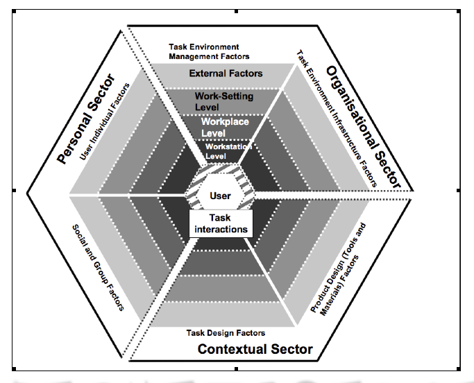 technology, furniture, co-workers and other people in the vicinity, facilities and resources. This wider definition of the interface is compound and complex; it is not just limited to the human-machine interface, and its interactions are subject to influence (both positive and negative) from multiple factors at the workplace, work setting and external levels. The subdivisions to the outer rings intend to ensure a sharp focus of analysis, greater rigour and consistency across applications. The model further encourages breadth of consideration, so that all possible influences are addressed. Contextual factors need to be set each time the model is applied, specific to the application under consideration. For a more detailed description of the parts of the model, the reader is referred to Benedyk et al (2009).