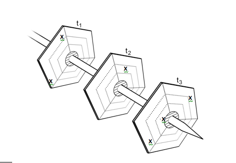 Tasks are rarely undertaken singly. The user might move from task to task consecutively, or perform more than one task concurrently. These tasks have the same user in common, and often the same external environment, perhaps even the same organisational management, but they may require different equipment, different settings and entail different user requirements, at different times. Because they are not entirely independent of each other, and relate along a time dimension, it can be useful to see their hexagons arranged as ‘plates’ on a ‘time spindle’ as in Figure 4. The commonality of the user links them at the centre.